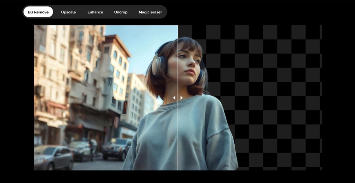 Popular image editing tools including upscale, background removal, enhance, and magic eraser.