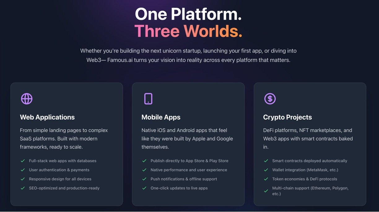 Famous AI is an AI-powered app builder that transforms ideas into fully functional, production-grade web and mobile apps from simple natural language prompts in minutes. It generates clean, modular, and scalable code with complete features including authentication, payments, databases, and backend logic. Famous AI offers instant deployment, complete codebase ownership, and allows rapid iteration and feature expansion by simply describing changes through prompts. Users can build apps without coding knowledge, but developers will appreciate the quality and control over the generated code. It supports native integration with Apple App Store and Google Play Store for direct app submission and seamless version updates.