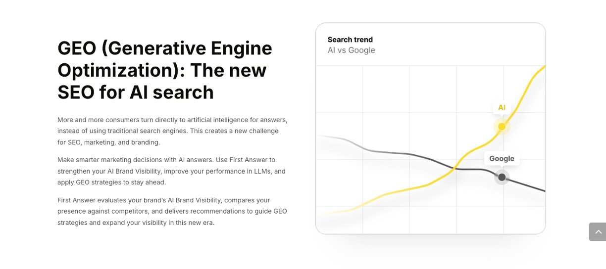 First Answer AI is an AI-powered platform designed to help brands monitor and improve their visibility across leading AI platforms such as ChatGPT, Gemini, Perplexity, Copilot, and others. It tracks how often your brand is mentioned in AI-generated answers, compares your presence with competitors, and gives insights into your average visibility position. This helps brands understand their status in the AI-driven search ecosystem and take targeted actions to increase their visibility and influence in AI search results.