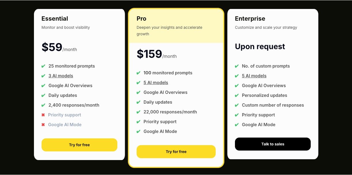 Tracks brand mentions and visibility across multiple major AI platforms, including ChatGPT, Gemini, Perplexity, and Google AI Overviews.