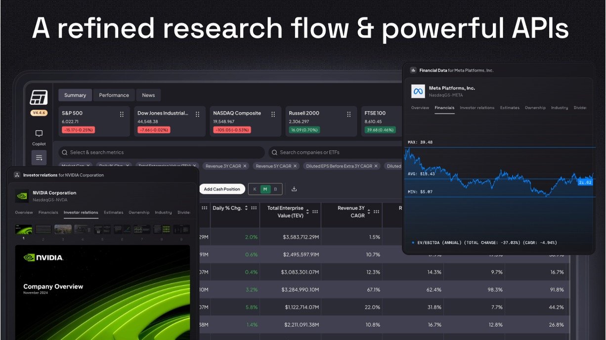Access detailed financial statements, KPIs, and segments for thousands of firms, plus earnings calls and filings you can "chat" with.