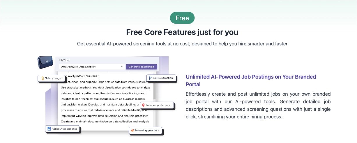 • Unlimited AI-powered job postings on your own branded portal, with one-click job descriptions and screening questions.​