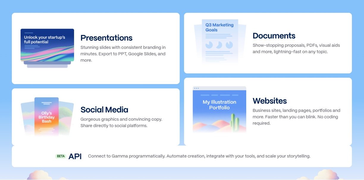 AI-driven content generation that creates presentations, documents, and websites from prompts, text, files, or URLs.