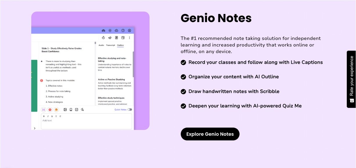 Genio offers beautifully simple AI-powered learning tools designed to help students overcome common study challenges like time shortages, feeling unprepared, or information overload. It provides note-taking apps, courses, and resources that work online or offline on any device, boosting productivity and confidence for independent learning. Loved by over 1,000 institutions worldwide, Genio turns frustration into success by equipping learners with skills to engage actively in their education.