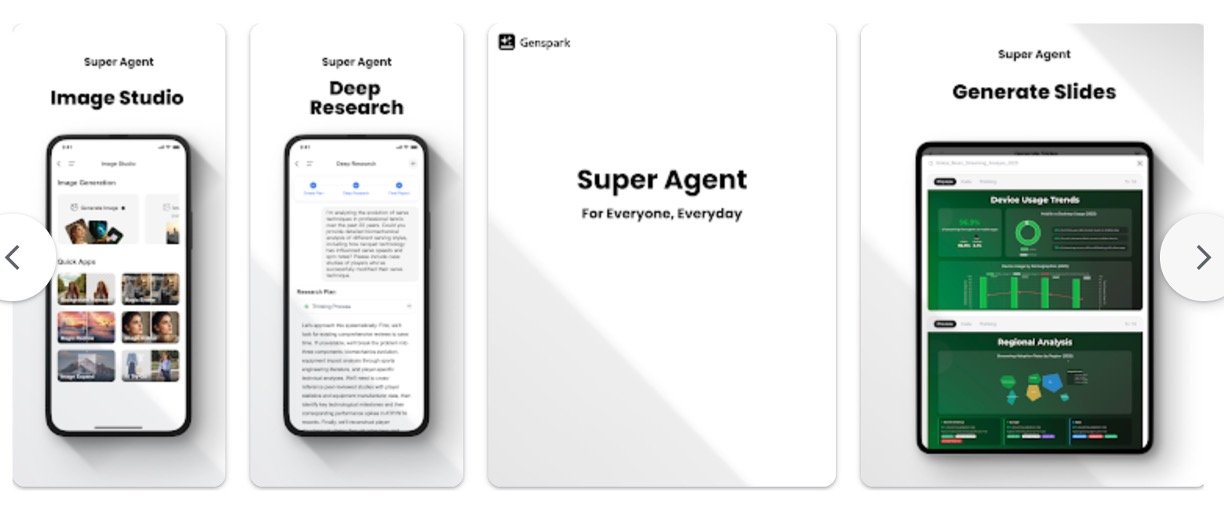 Super Agent: Handles trip planning, product research, problem solving, and multimedia (image, video, audio) generation.