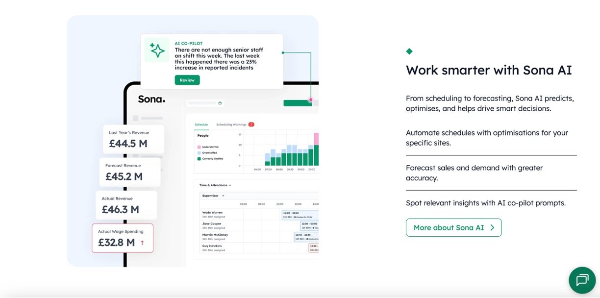 Sona AI Optimization: Predicts demand, automates schedules, forecasts sales, and spots insights via AI co-pilot prompts for better decisions.