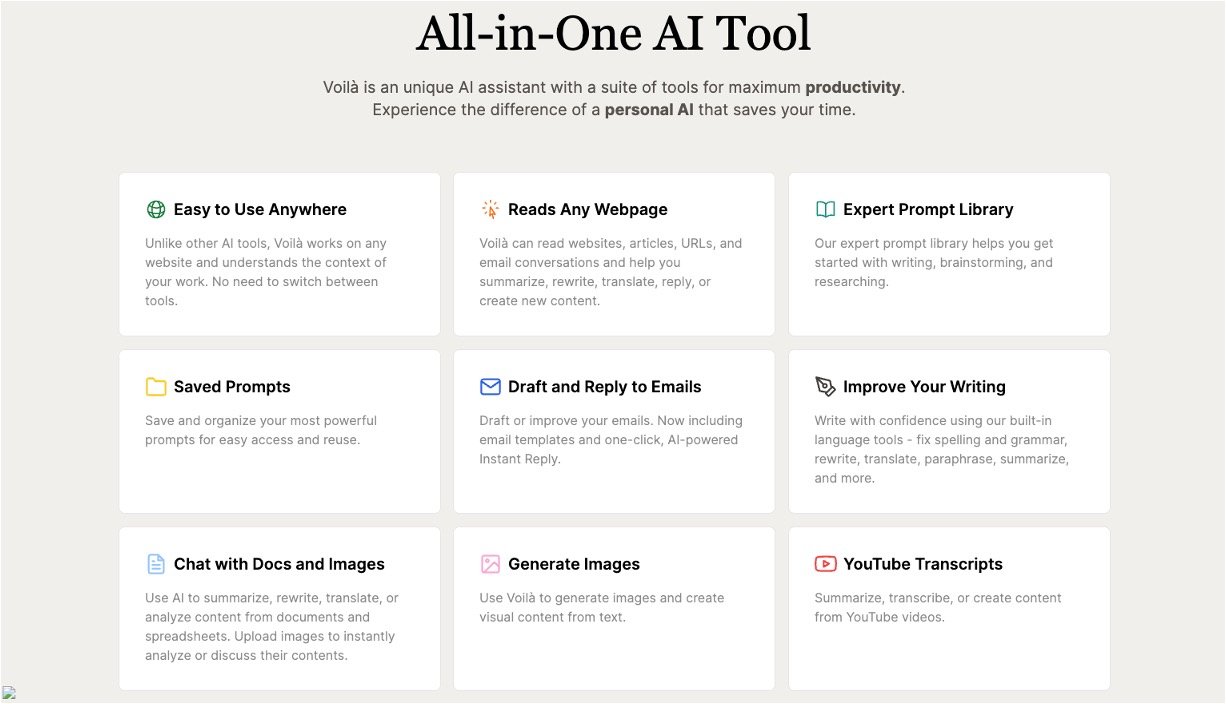 Voilà is a friendly AI assistant that fits right into your daily work, helping you chat with websites, documents, and images to create, write, brainstorm, and research faster. No need to switch apps—it's like having a smart helper open on any page, summarizing articles, drafting emails, or generating ideas with a simple click. Trusted by over 100,000 people worldwide, it turns everyday tasks into quick wins, all while keeping your info private.