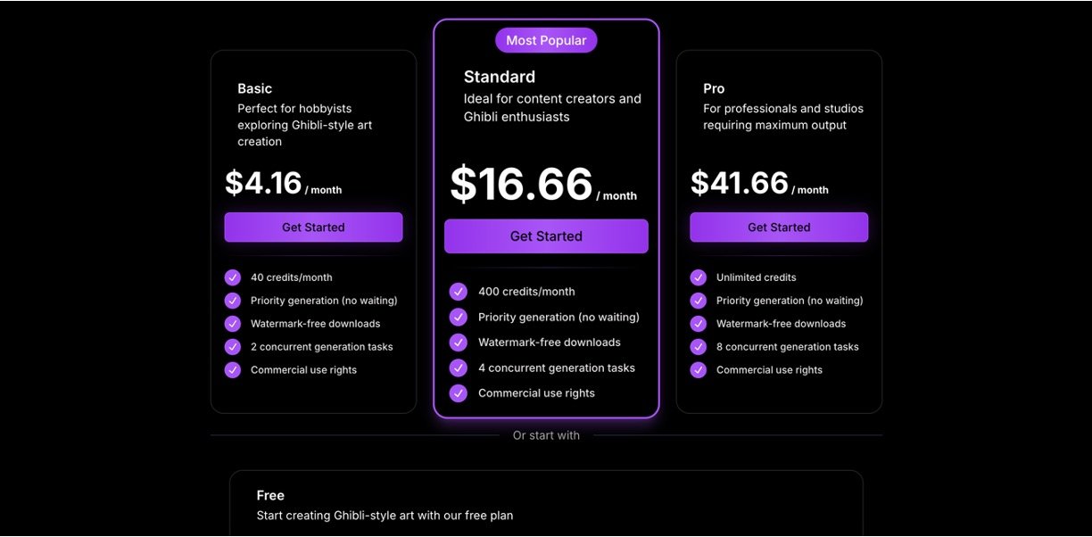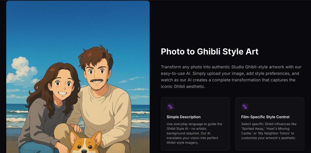 • Photo-to-Ghibli Style Transformation: Upload any image to instantly receive a richly detailed Studio Ghibli style artwork.