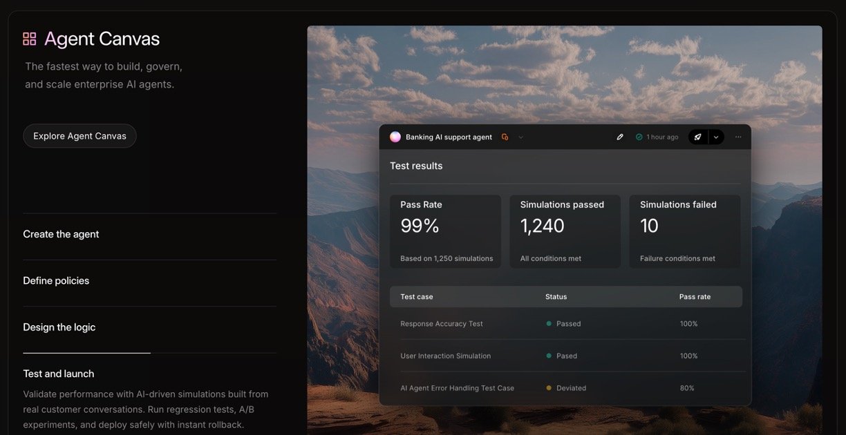 • Low-code Agent Canvas platform to create, test, and launch custom AI voice and chat agents.