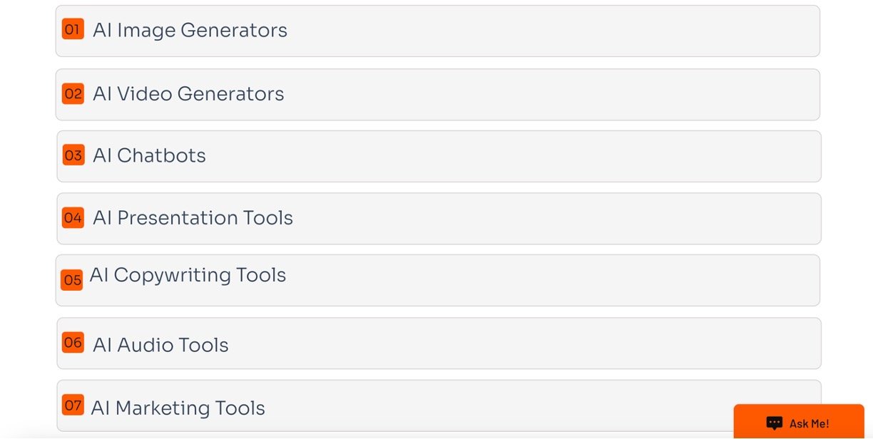 • Categorized for Easy Navigation: Organized into clear categories such as AI image generators, video creation, chatbots, music, SEO, and marketing tools for efficient discovery.