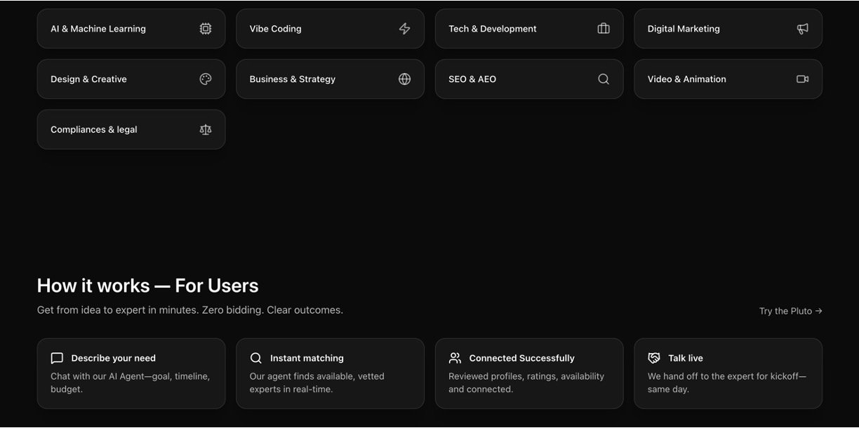 GoPluto AI is a fast platform that links people needing help with vetted experts, like AI engineers or specialists, through an always-online AI agent. You chat about your goal, timeline, and budget, and it instantly finds the right match based on skills, ratings, and availability. No more waiting in inboxes—get a live handoff to start working right away, with clear milestones for delivery and fast payments.
