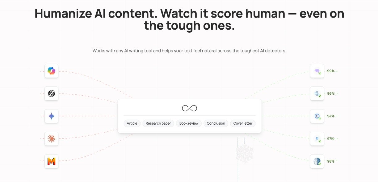 GPTinf acts as your go-to AI humanizer and detector, rephrasing machine-written content to make it undetectable by tools like GPTZero, Turnitin, or ZeroGPT. It tweaks vocabulary, sentence structure, and flow to mimic real human writing, while keeping your key ideas intact. Perfect for anyone needing quick, reliable results without tech headaches, it offers free trials and simple plans starting small.