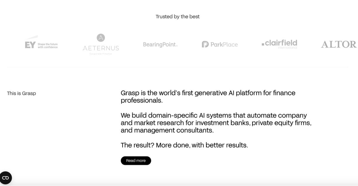 Grasp is a cutting-edge AI platform tailored for finance professionals, specifically designed to automate and optimize company and market research tasks. Trusted by major investment banks, private equity firms, and management consultants, Grasp's AI Analyst streamlines processes such as buyer and target analysis, company evaluations, and portfolio construction. The platform drastically reduces manual workload while delivering accurate, exhaustive data and insights, enabling finance teams to work more efficiently and make better-informed decisions.