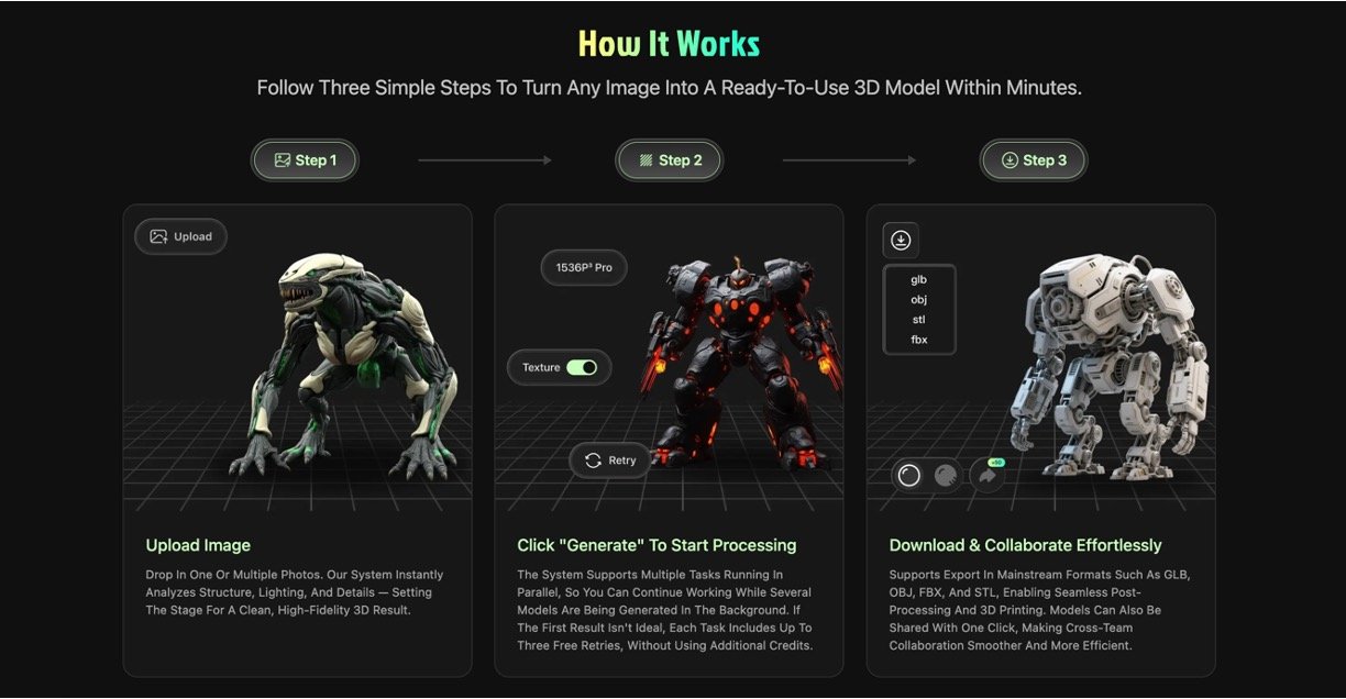 • Exports in easy formats like GLB, OBJ, and STL, working seamlessly with Blender, Unity, Maya, or 3D printers.