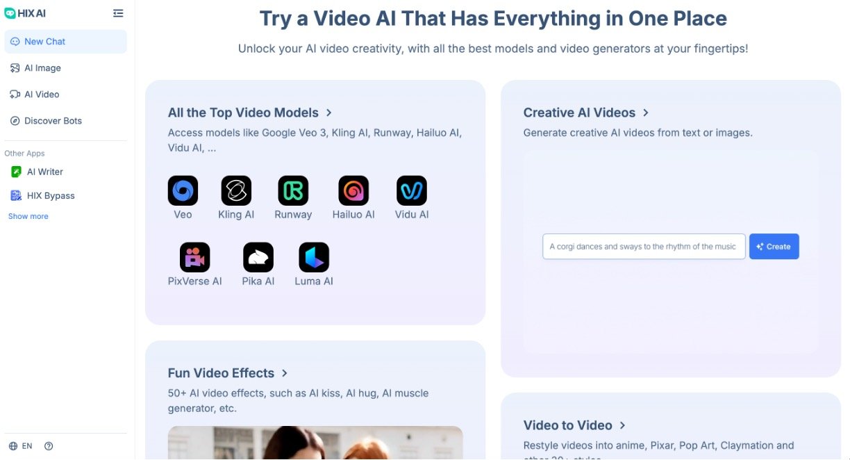 AI-powered chatbots including HIX Tutor for homework help, AI Presentation for slide creation, and ArticleGPT for factual content generation.
