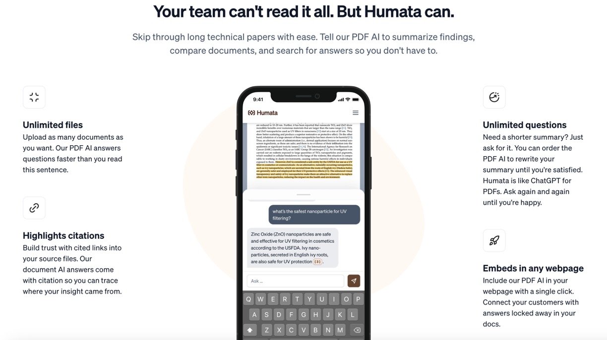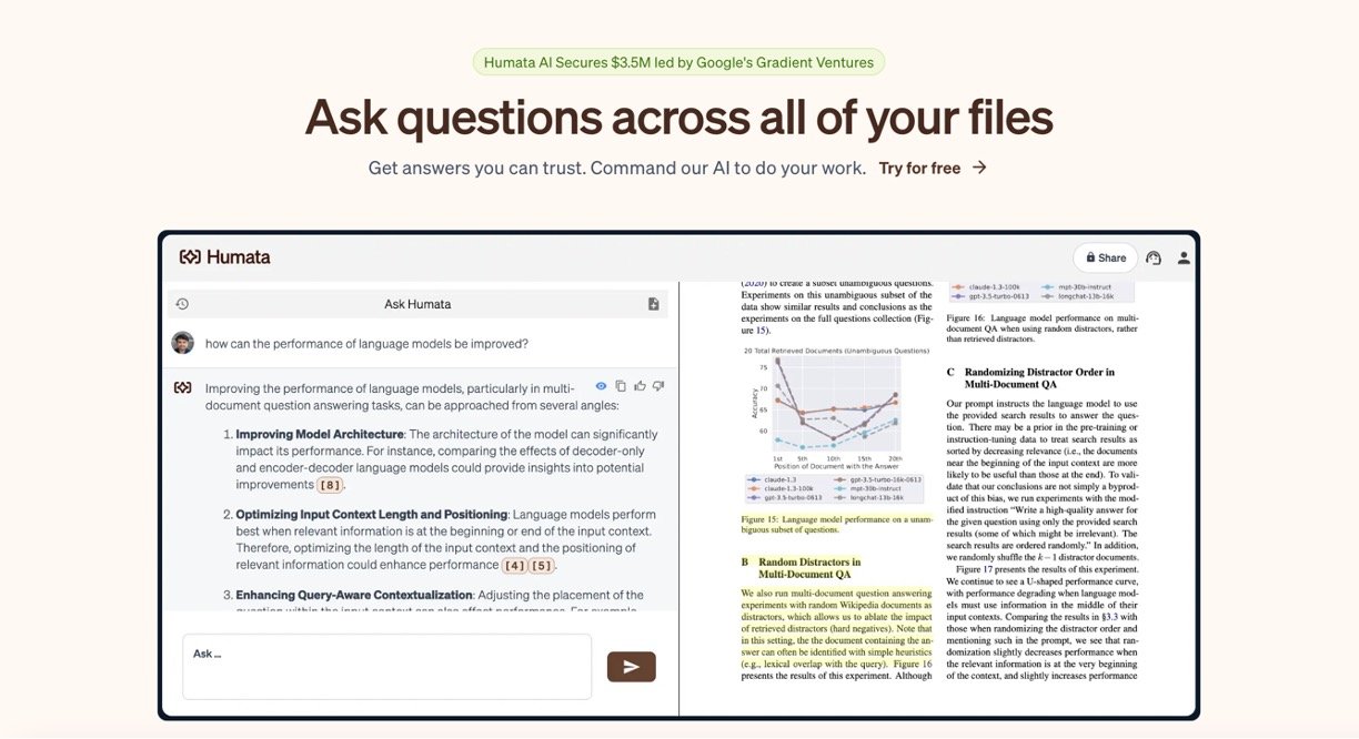 Humata AI is an advanced AI-powered document assistant designed to make reading, understanding, and analyzing complex documents effortless. It allows users to upload unlimited files—such as PDFs, Word docs, and spreadsheets—and instantly get summaries, detailed answers, and comparisons backed by citations from the original content. Designed for professionals, researchers, students, and teams, Humata AI speeds up research and data analysis while ensuring trustworthiness and security.
