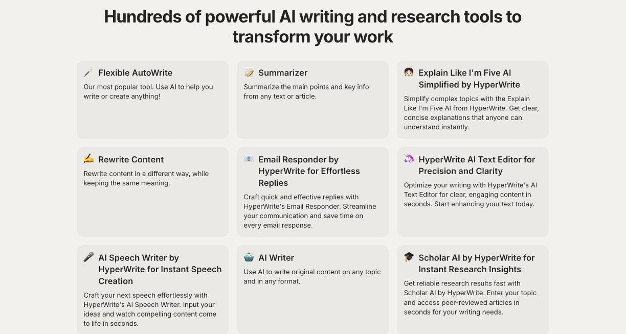HyperWrite is an AI writing and research assistant that helps you draft, edit, and improve text across the web. It offers hundreds of specialized tools for tasks like writing emails, essays, marketing copy, and academic content. Through its web app and browser extension, it gives context-aware suggestions that adapt to your style, making your writing clearer, faster, and more professional.