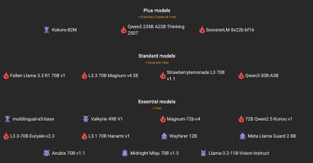 Curated Top LLMs: Access free, essential, standard, and plus models like Qwen2.5-72B, Llama variants, and even huge 235B ones, updated regularly from leaderboards.
