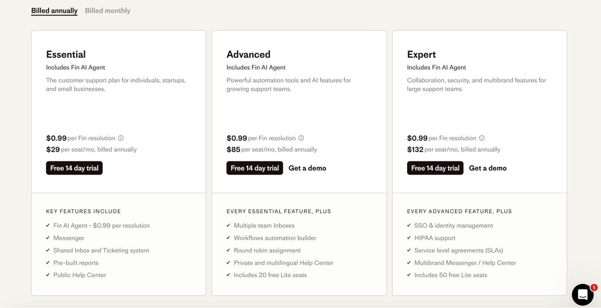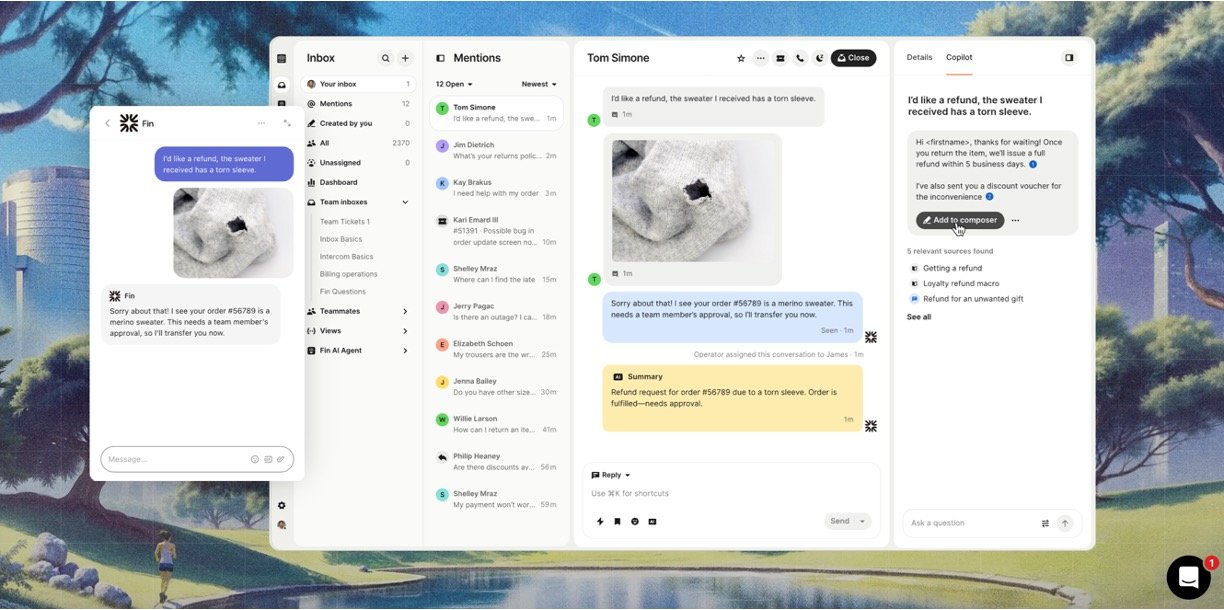 AI-Powered Support Suite: Includes the Fin AI agent for complex query handling, Copilot AI to assist human agents, and automated workflow tools to improve team productivity.