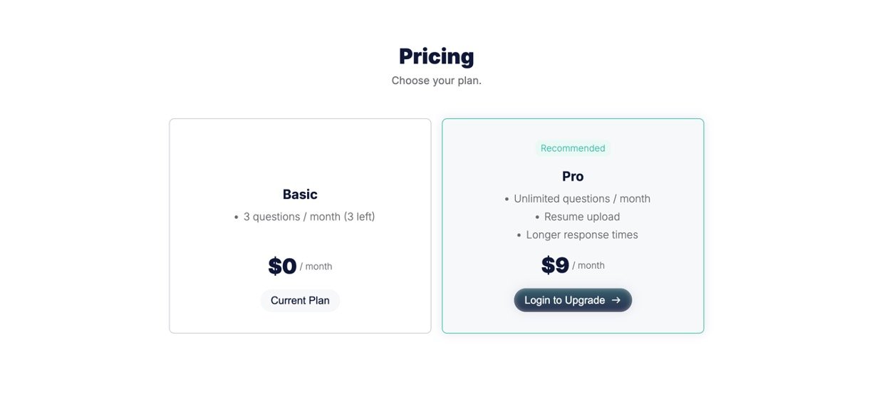 Pro Dashboard: Save sessions, upload your resume for better insights, and review progress (unlimited with paid plan).