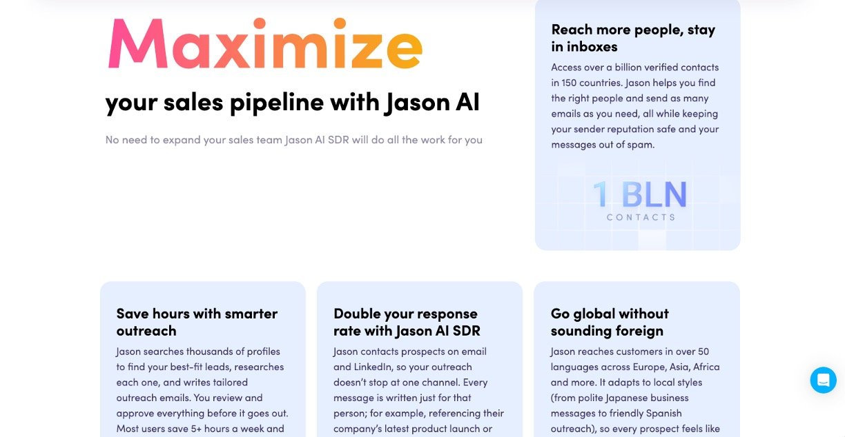 Jason AI is your smart virtual salesperson who learns your product, strategy, and ideal customers to handle outreach like a pro. It pulls from over 1 billion verified contacts worldwide, crafts personalized emails and LinkedIn messages in 50+ languages, manages replies, and books meetings directly into your calendar. No need to hire extra staff—save hours each week, double response rates, and scale sales without the $8,000/month cost of a traditional SDR.