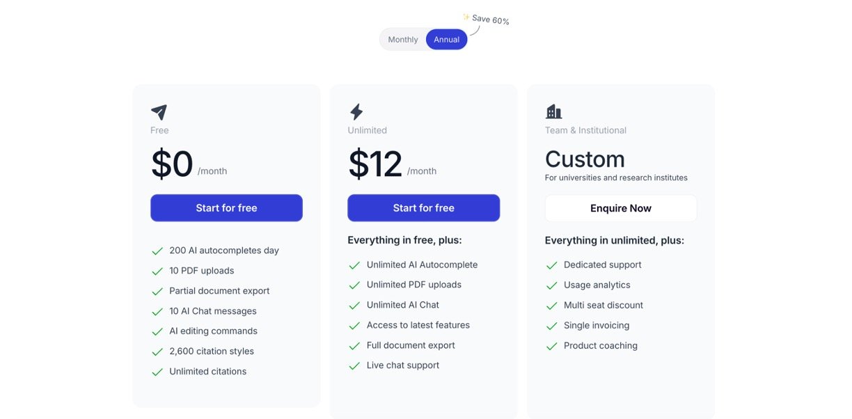 AI Autocomplete and writing suggestions that help overcome writer’s block by generating content based on user input and uploaded research.