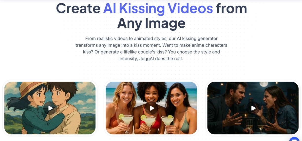 JoggAI's AI Kissing Generator lets anyone create realistic kissing videos from simple photos, bringing couples, characters, or even pets to life with fun, emotional scenes. No editing skills needed – just upload images and pick a style for cinematic results that feel real. Perfect for surprises, social shares, or creative fun, it uses smart AI to handle movements and emotions effortlessly.