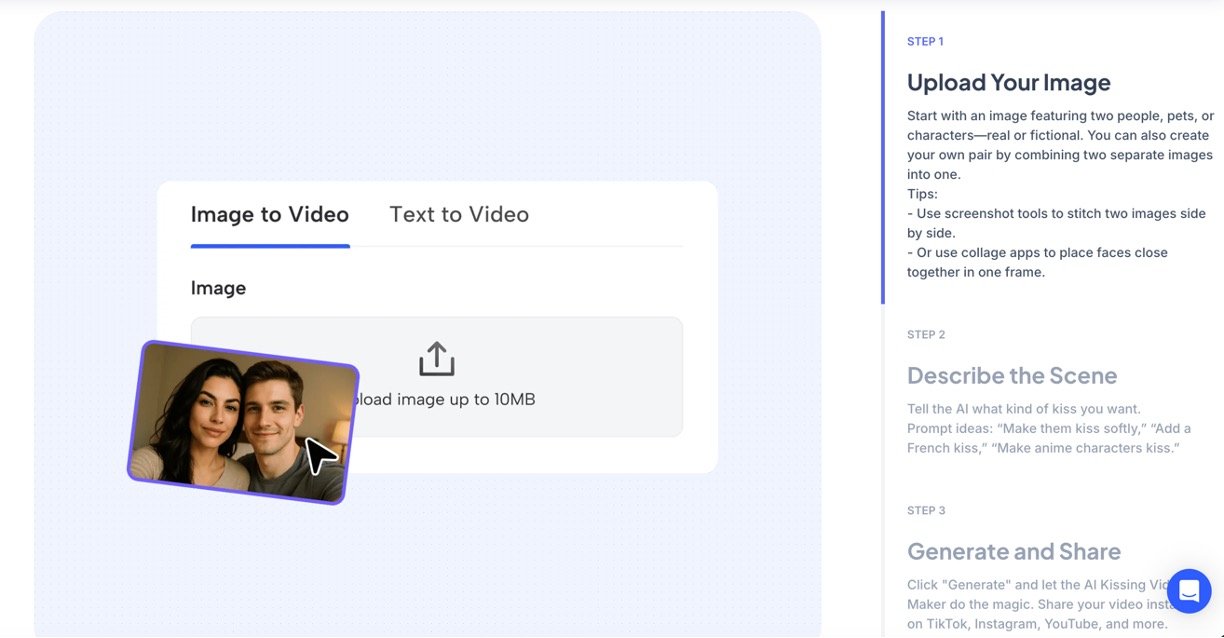 Upload any photos of people, anime characters, or pets to generate lifelike kissing videos in seconds.
