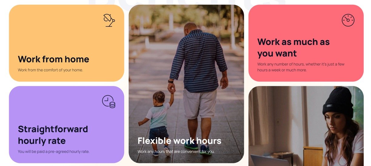 Flexible, remote work: Open-ended contract work with no fixed schedule or set hours, so you choose when and how much you work.