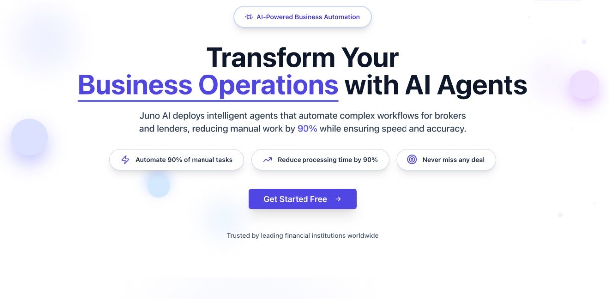 Juno AI is an AI-powered business automation platform designed specifically for brokers and lenders to automate complex workflows and drastically reduce manual work. It helps businesses speed up processing times by up to 90%, automate routine tasks, and improve accuracy in lead qualification, document validation, and application routing. Juno AI integrates seamlessly with existing CRMs, LOS, and LMS systems and operates around the clock to increase efficiency, handle higher volumes without extra staff, and free teams to focus on strategic growth.