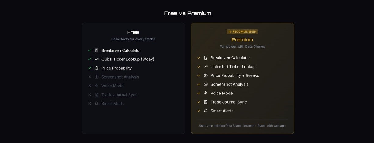 Freemium Access: Start free with 3000 data shares on signup, upgrade for custom options trading and more.