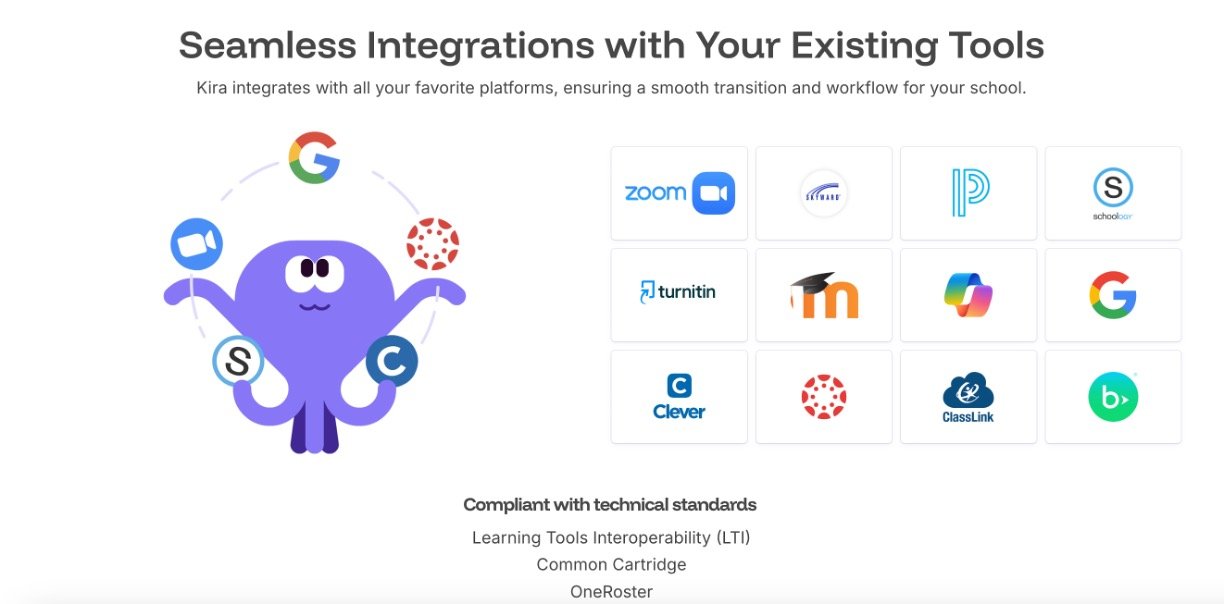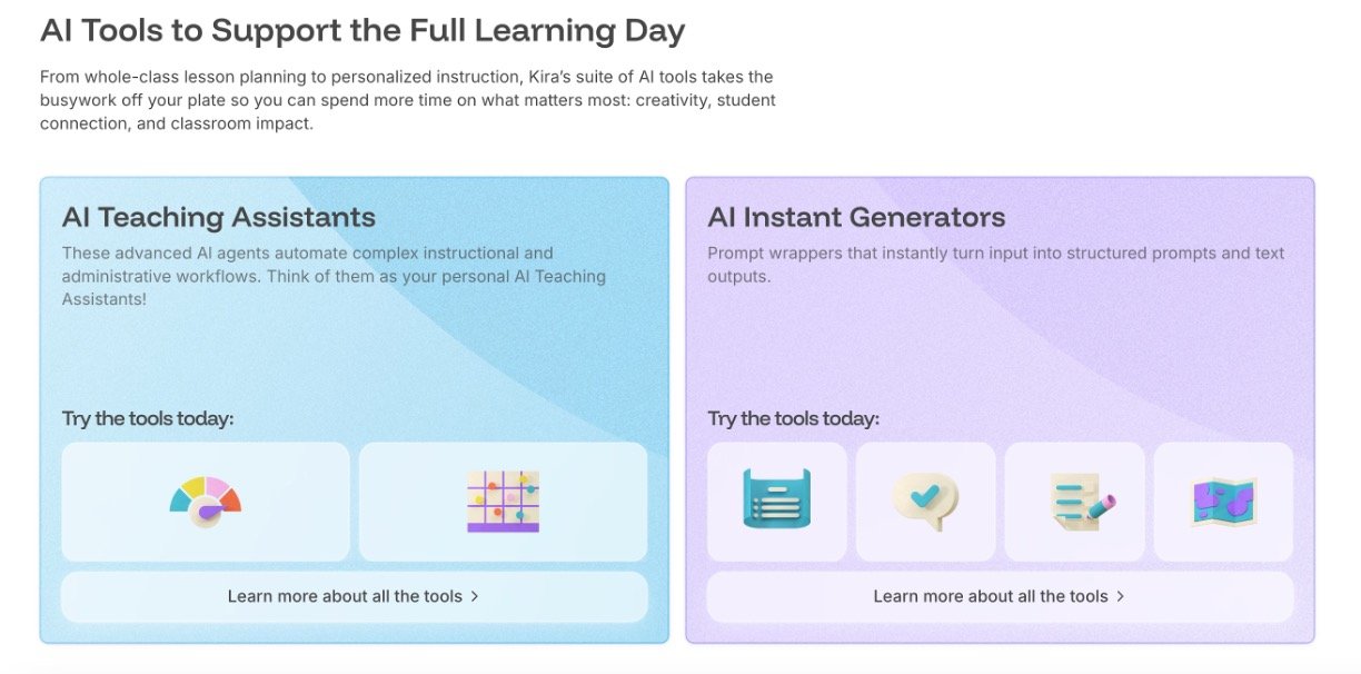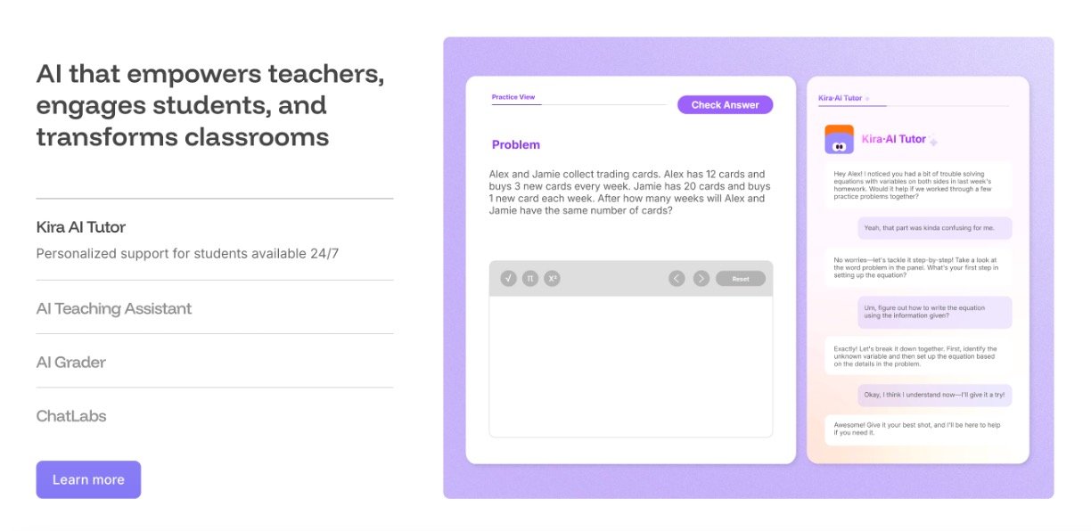 Kira Learning is an AI-powered platform built specifically to support teachers and students across the entire K-12 journey, making education more personalized, efficient, and engaging. Unlike traditional classroom tools, Kira seamlessly integrates artificial intelligence into every step—from lesson planning and instruction to automated grading, feedback, and analytics—so teachers can focus on creativity and connection while each student’s needs are addressed in real time. Designed for flexibility, Kira can be used as a standalone teaching assistant or alongside existing school systems, making it easy to adopt in any educational environment.