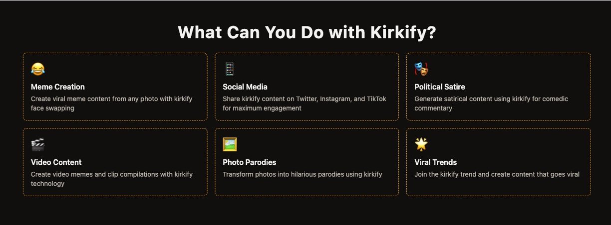 Kirkify is an advanced AI-powered meme generator that creates viral comedic content by automatically swapping faces in your photos and videos with that of Charlie Kirk, overlaid with a distinctive neon frame effect called "Kirkification." It supports popular image and video formats, processing media in seconds to produce satirical and humorous memes ready for social sharing. The tool is web-based and easy to use, requiring no downloads or sign-ups for first-time users, making AI meme creation accessible even for those with little technical background.