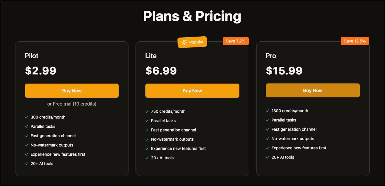 Multiple payment tiers including free, pay-as-you-go, and monthly subscriptions for watermark removal, HD/UHD exports, priority processing, and video meme creation.