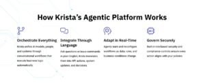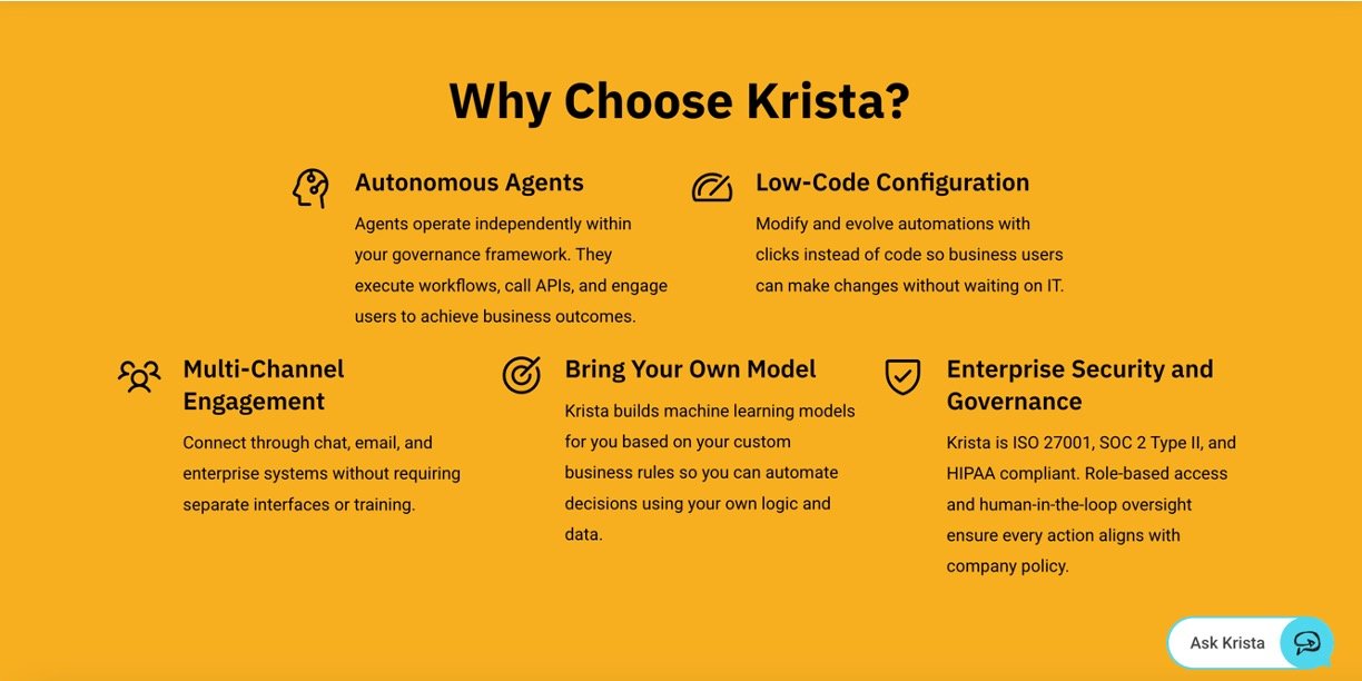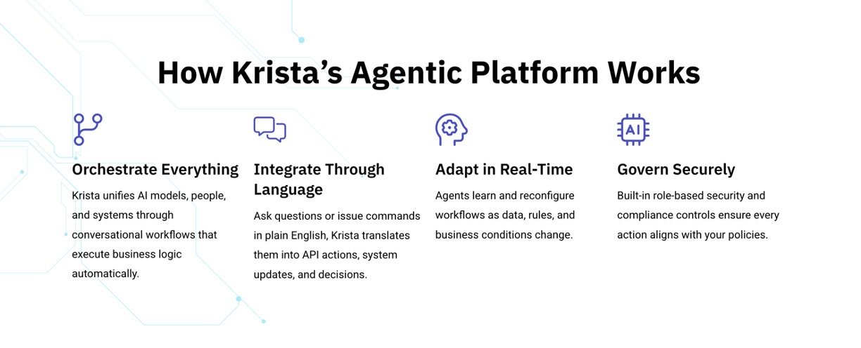 Krista AI is an enterprise-grade agentic automation platform that orchestrates people, systems, and AI agents through natural language to automate complex business workflows end-to-end. It addresses the challenge of fragmented AI and SaaS tools by unifying operations, enabling businesses to replace scattered, manual processes with seamless conversational automation. The platform offers low-code configuration, allowing business users to modify automations without coding, while delivering autonomous agents that perform tasks, call APIs, and interact with users to drive outcomes. Krista supports multi-channel engagement via chat, email, and integrated enterprise systems.