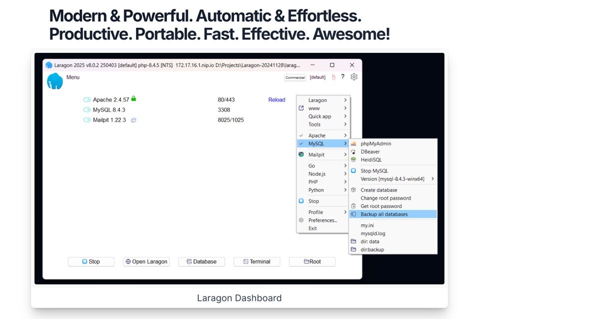 Portable & Crash-Proof: Copy the folder anywhere, auto-backup databases, and run tools like Composer or ngrok without global installs.