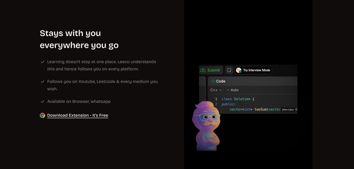 Integrated Browser Extension: Available as a Chrome extension that works alongside platforms like LeetCode and YouTube for real-time assistance.