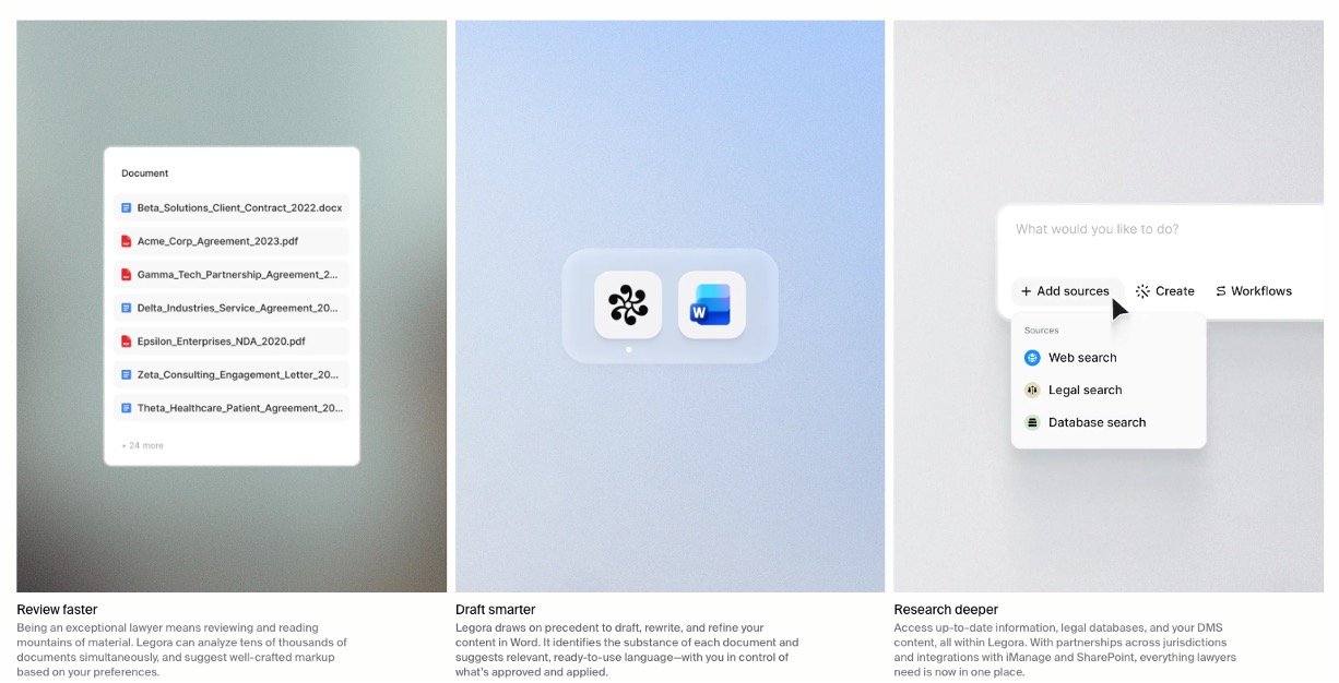 Pulls in fresh legal info, databases, and your firm's files (like iManage or SharePoint) for one-stop research.