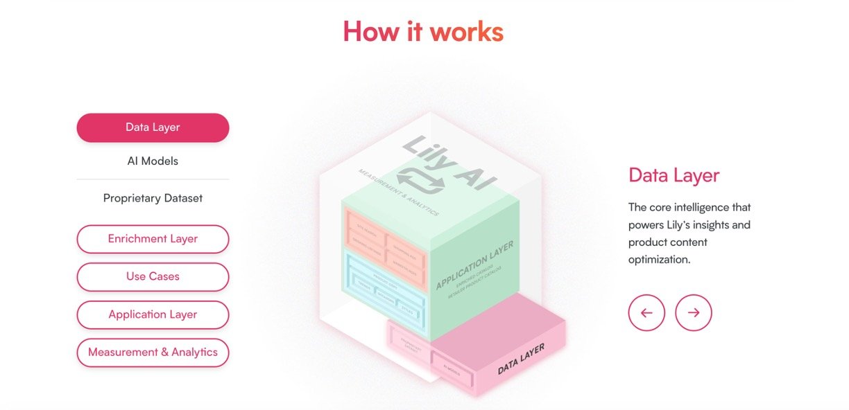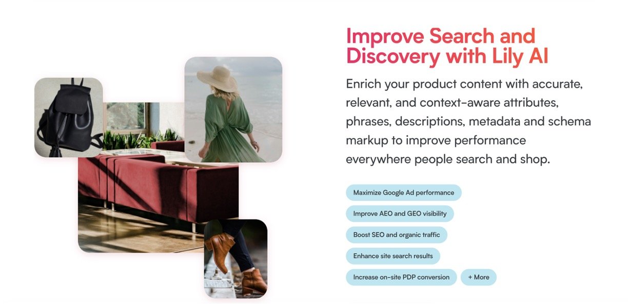 Lily AI is a smart tool that supercharges your online store's product listings. It uses AI to analyze your product catalog, add rich details like trends and styles, and create descriptions that appeal to both people shopping and search engines finding them. This leads to more visibility, clicks, and sales across sites, ads, and marketplaces—trusted by big brands for quick wins like 25-40% more site traffic and 5-9% higher conversions.
