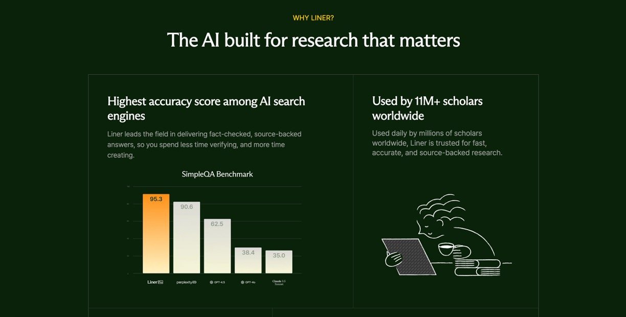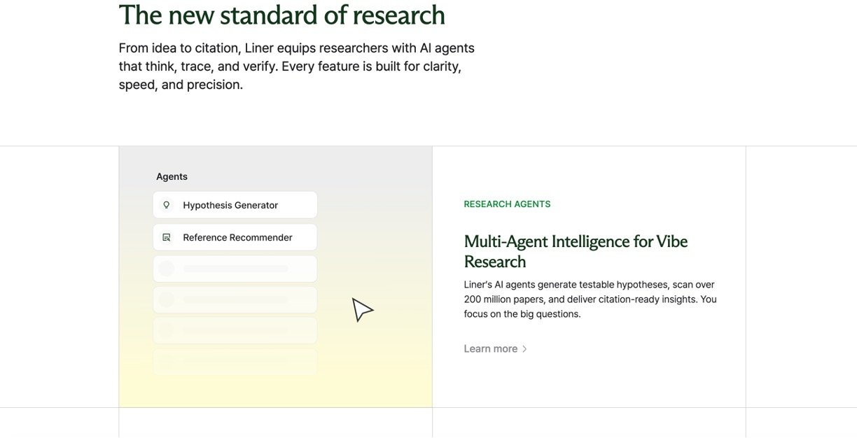 Liner is a cutting-edge AI-powered search engine designed specifically for academic and professional research. Trusted by over 11 million scholars worldwide, it delivers quick, reliable, and citable research results by scanning over 200 million academic papers and verified sources. Liner’s AI agents think critically and provide line-by-line source citations, allowing users to trust and verify every piece of information instantly. It offers advanced tools for deep research, hypothesis generation, and academic writing support, making the research process faster, clearer, and more precise.