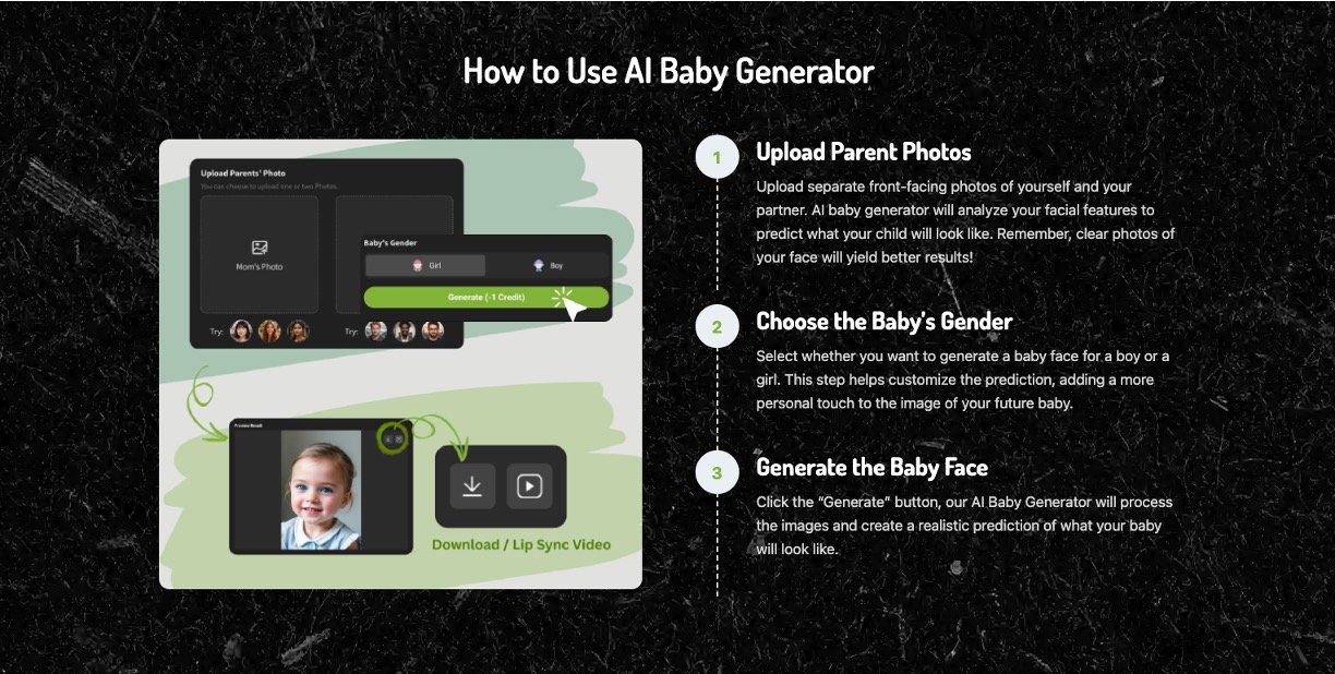 AI Baby Generator at lipsync.video lets you upload photos of yourself and your partner to instantly create a super-realistic image of what your future baby might look like—complete with options to make it talk or sing for extra fun. This free online tool uses smart AI to blend facial features from one or two parent photos, predicting a lifelike baby portrait you can customize by gender. Unlike basic generators, it goes further by letting you animate the baby face with talking or singing videos using text, audio, or songs in multiple languages. Perfect for curious couples, family laughs, or viral social media shares, it's easy—no skills needed, just upload and generate.