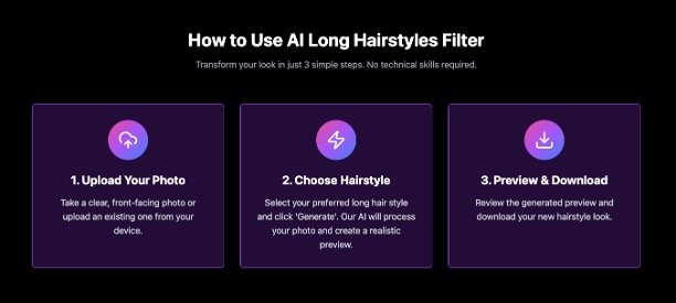 • Instant previews of long hairstyles like boho waves, sleek straights, and layered cuts in under 30 seconds.