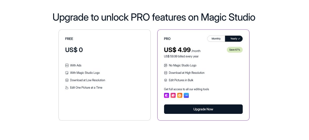 Free version available, with Pro offering batch editing, high‑resolution downloads, and access to other Magic Studio tools like Background Remover and Image Upscaler.