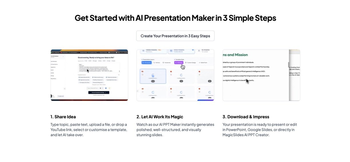 MagicSlides is a super simple AI tool that creates professional presentations right away, just by typing a topic, pasting text, or uploading files like PDFs, YouTube links, or Word docs. Forget staring at blank slides; it handles the hard work of picking layouts, adding visuals, and formatting everything nicely. Perfect for busy students, teachers, or anyone who wants polished slides without the hassle, and it works in over 136 languages so you can shine in any tongue.