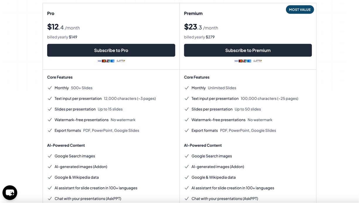 Whip up special slides like pros/cons, timelines, SWOT analysis, metrics, or bullet points with images—just enter a topic.