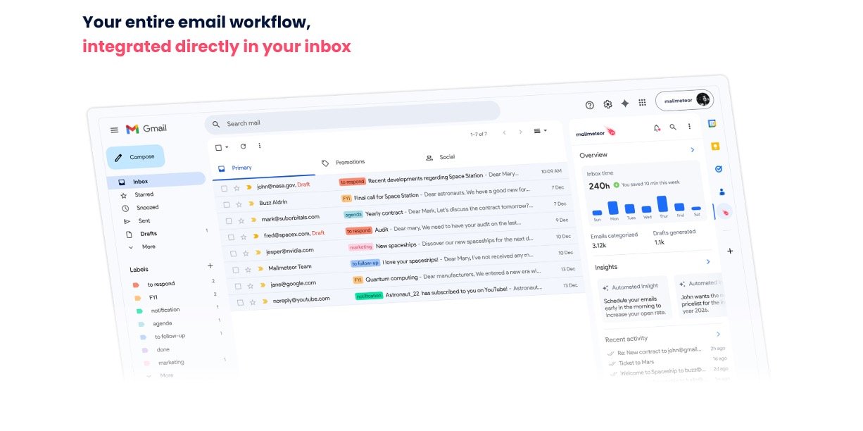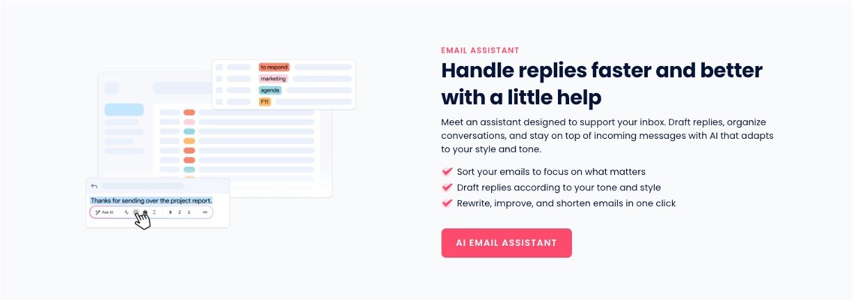 AI Email Assistant: Automatically sorts inbox (e.g., "to respond"), drafts replies matching your tone, and refines text in one click.