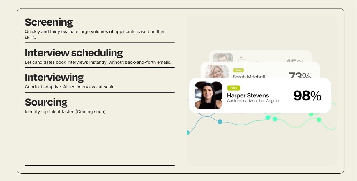 Comprehensive Hiring Automation: Automate tasks such as candidate screening, interview scheduling, and conducting adaptive AI-led interviews.