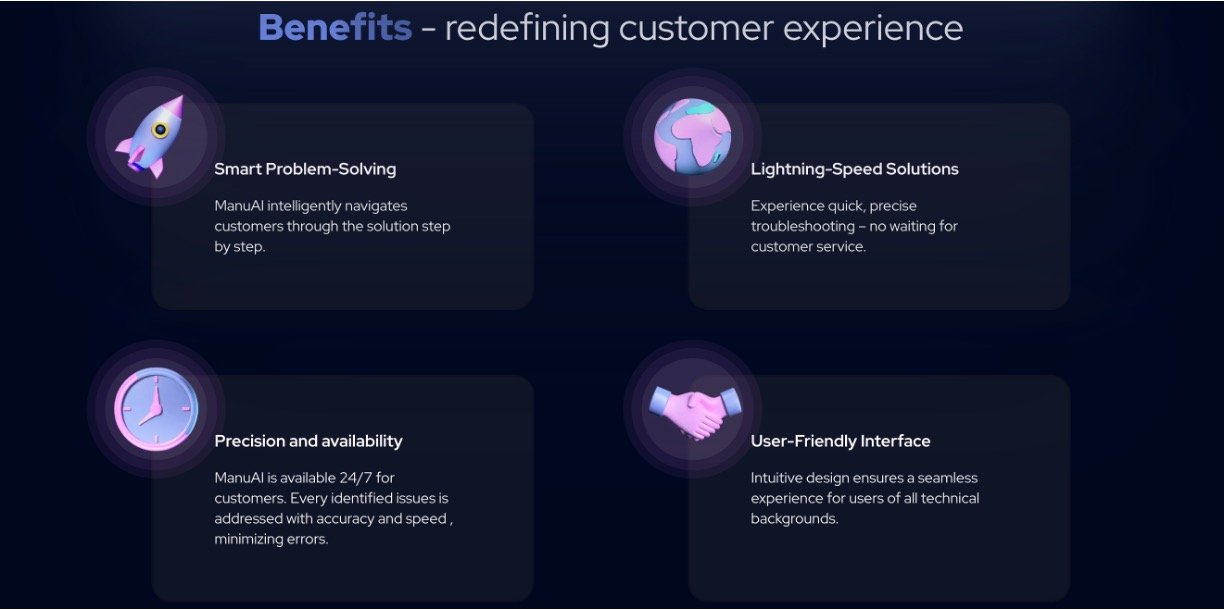 ManuAI is an AI-powered support companion designed to seamlessly connect with business systems like ERP, CRM, e-commerce platforms, and user manuals to assist customers throughout their product journey. It provides instant access to product information and troubleshooting help using text, voice, or image communication. ManuAI’s user-friendly design makes it easy for customers of any technical background to solve problems quickly, reducing traditional support wait times and operational costs.