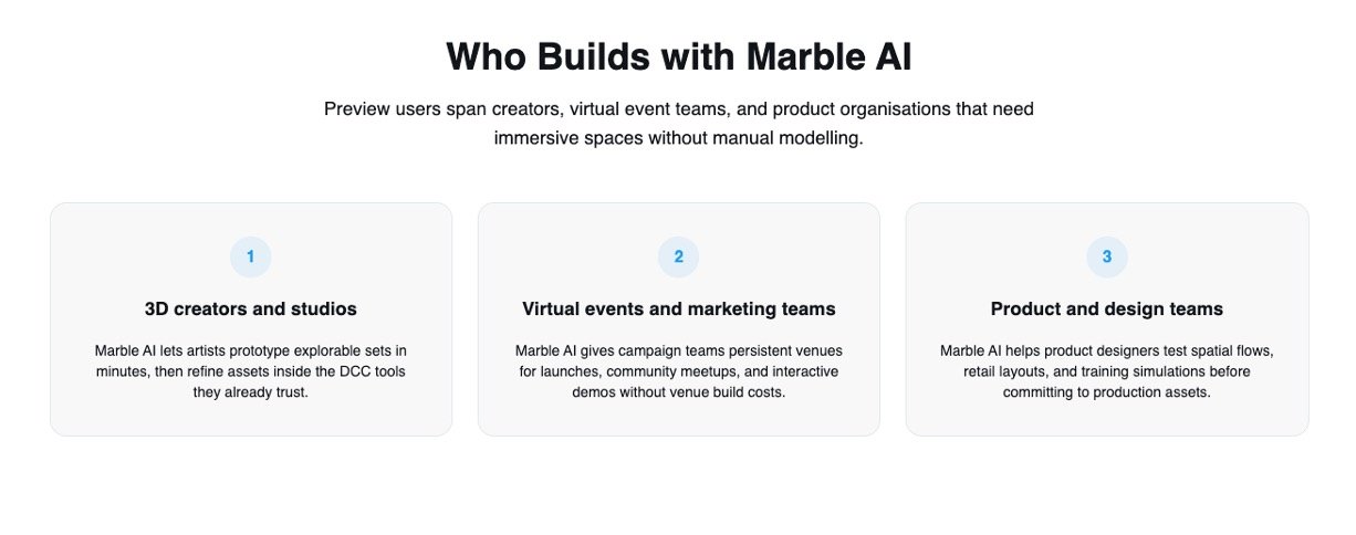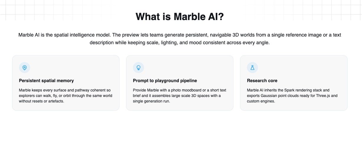 Marble AI by World Labs is an advanced AI-powered platform that transforms simple images, text prompts, videos, or 3D sketches into fully explorable, persistent 3D worlds. Unlike many real-time generators, Marble creates stable environments that maintain their structure, lighting, and details consistently across multiple sessions and viewing angles. These worlds are immediately viewable in browsers, VR headsets like Apple Vision Pro and Meta Quest 3, or game engines, making them production-ready for creative, marketing, or design workflows. Marble also includes an AI-native editor that lets users define spatial layouts intuitively, with the AI filling in textures and visual details.