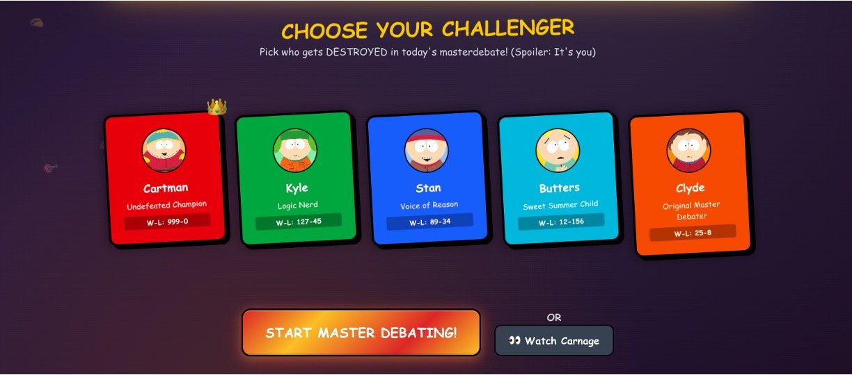 Character-Driven Debates: Battle AI versions of Cartman and others with their signature trash-talk and "respect my authoritah" style for immersive fun.
